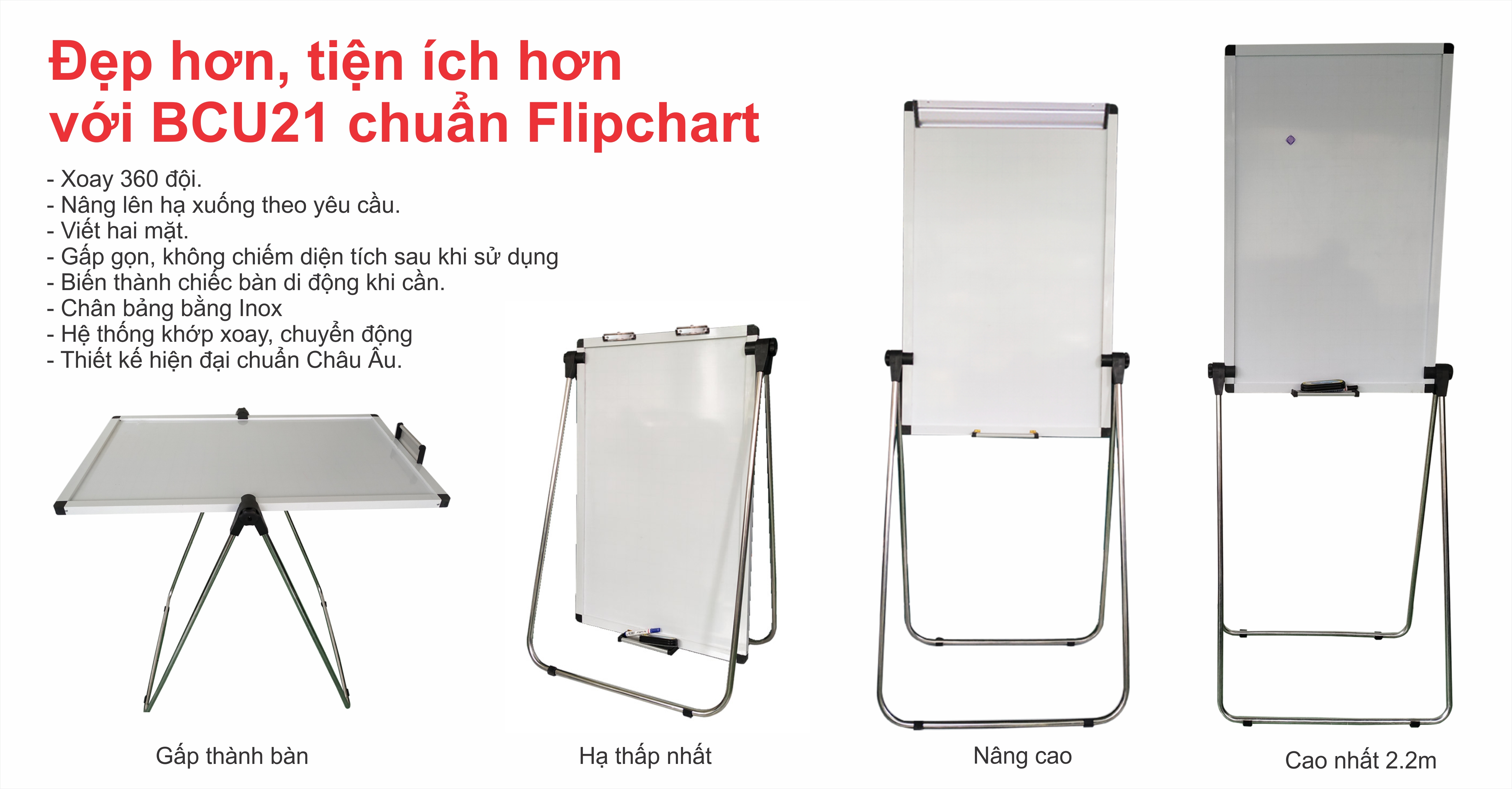 - Ngày nay, tất cả chúng ta thường muốn tích hợp nhiều tính năng hơn cho bất kỳ sản phẩm nào. Từ điện thoại, TIVI, bàn ghế, giường tủ tất cả đều muốn là 3 trong 1, 4 trong Cái lý của chúng ta là cái gì cũng phải tiện lợi, đơn giản, gọn nhẹ, ít chiếm diện tích. Vì thế bảng flipchart mẫu BCU21 ra đời là vì cái tiện lợi, đa chức năng đó. Cách đây khoảng 20-30 năm về trước khi công nghệ sản xuất bảng chưa phát triển chúng ta thường chỉ mong ước có được một chiếc bảng đen để sử dụng ở nhà hay lớp học cho tốt mà thôi, ngoài ra không còn mong ước gì thêm. Nhưng ngày nay khi kinh tế phát triển, chúng ta không còn phải lo đến chuyện có bảng hay không có bảng nữa mà chỉ là chúng ta có bao nhiêu tiền. Với số tiền bạn có bạn sẽ trở thành thượng đế được phục vụ tất cả theo nhu cầu và ý thích của mình "mình là người có tiền mà" mình cần là có người phục vụ ngay.