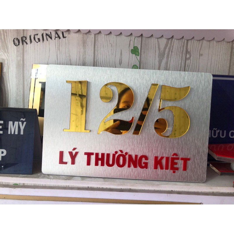 Bảng số nhà, bảng công ty alu bạc xước gắn mica gương nổi.