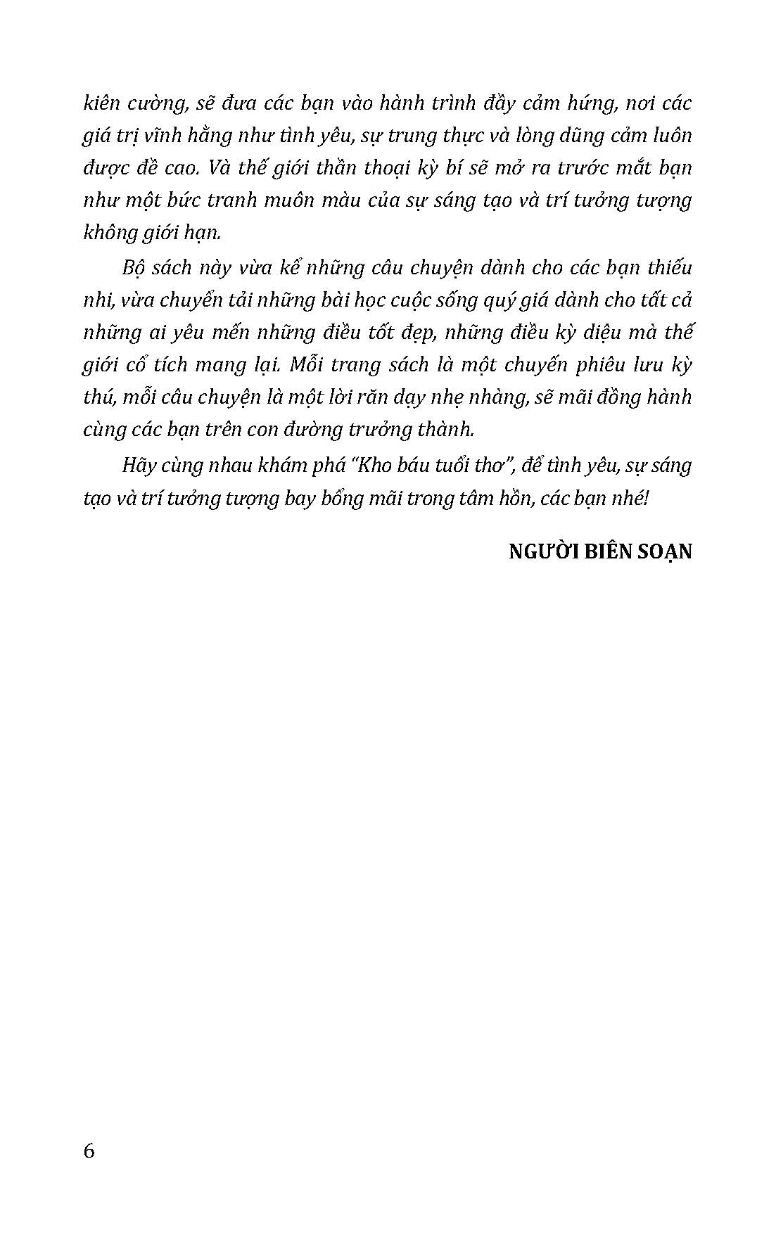 Bộ sách "KHO BÁU TUỔI THƠ" gồm 08 cuốn, là tuyển tập truyện cổ tích, thần thoại, ngụ ngôn và truyền thuyết đặc sắc, kết hợp giữa tinh hoa văn hóa Việt Nam và thế giới, là hành trình kỳ diệu giúp các bạn nhỏ phát triển trí tưởng tượng, đồng thời gieo mầm nhân ái, sự khôn ngoan và trách nhiệm, người bạn đồng hành giáo dục quý giá trên chặng đường trưởng thành.