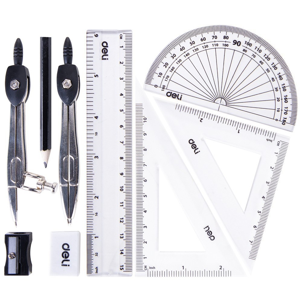 - Bộ dụng cụ học sinh 9 món - Deli G30695 gồm:- 2 thước ê-ke, 1 thước dài 15 cm và 1 thước đo độ, 2 compa, 1 bút chì gỗ gắn compa, 1 gôm, 1 đồ chuốt làm bằng nhựa tốt.- Tất cả đều là các công cụ khô...