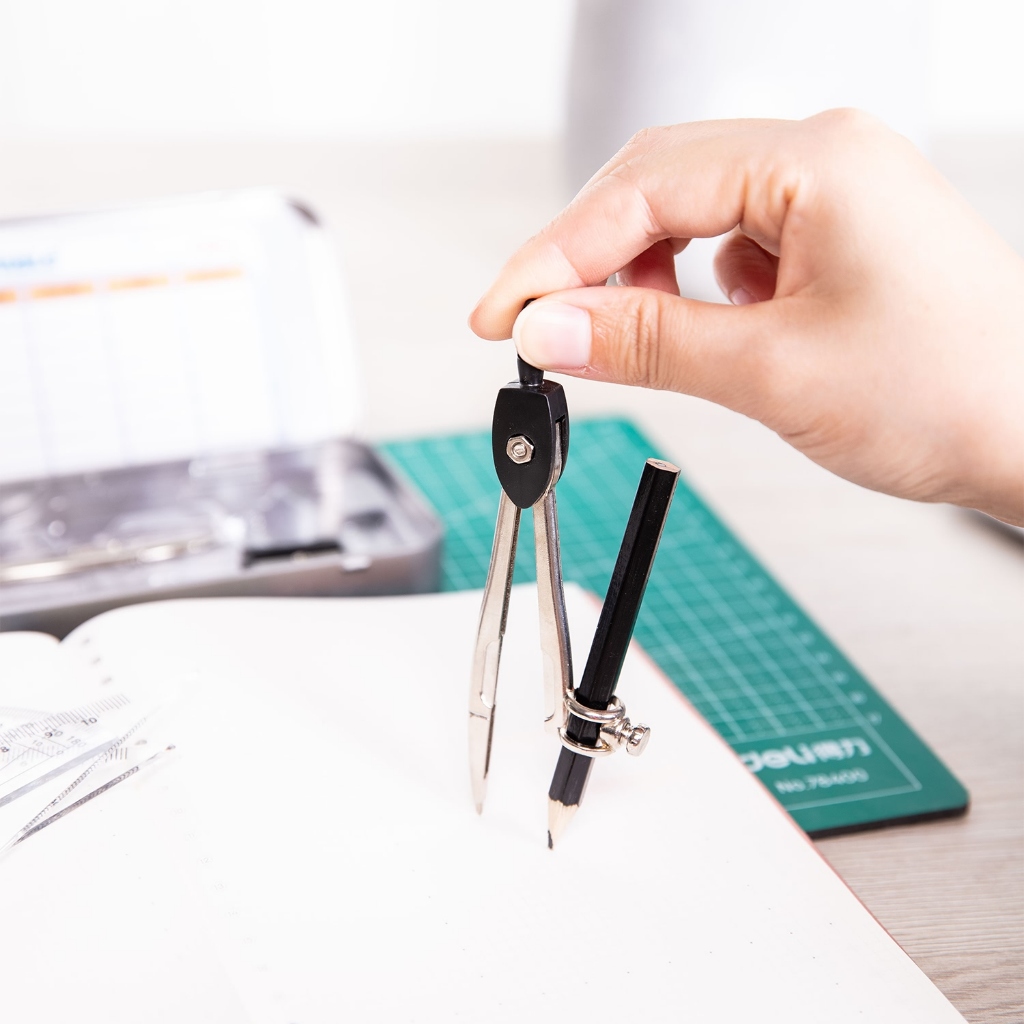 - 2 thước ê-ke, 1 thước dài 15 cm và 1 thước đo độ, 2 compa, 1 bút chì gỗ gắn compa, 1 gôm, 1 đồ chuốt làm bằng nhựa tốt.