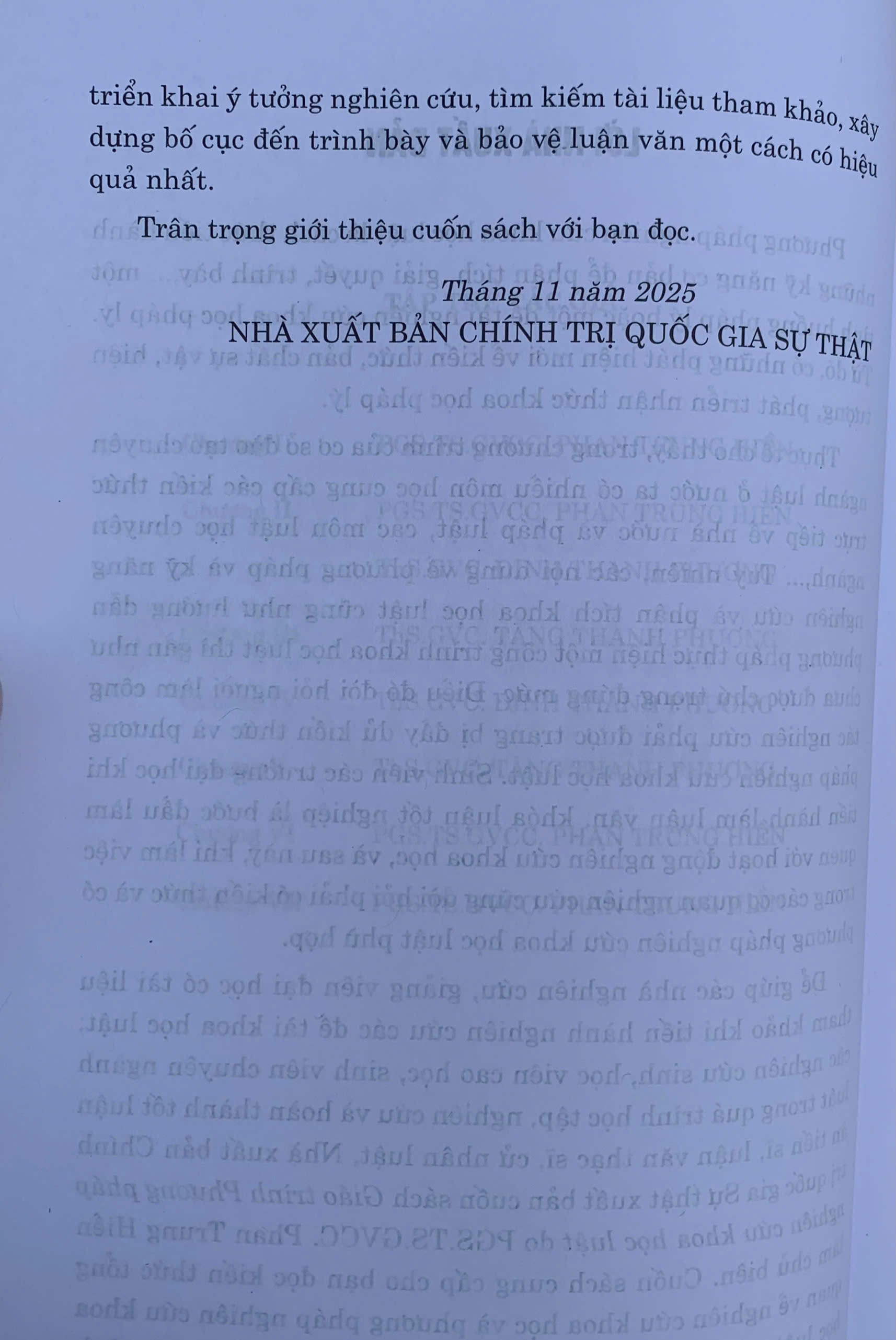 Để giúp các nhà nghiên cứu, giảng viên đại học có tài liệu tham khảo khi tiến hành nghiên cứu các đề tài khoa học luật; các nghiên cứu sinh, học viên cao học, sinh viên chuyên ngành luật trong quá trình học tập, nghiên cứu và hoàn thành tốt luận án tiến sĩ, luận văn thạc sĩ, cử nhân luật, Nhà xuất bản Chính trị quốc gia Sự thật xuất bản cuốn sách Giáo trình Phương pháp nghiên cứu khoa học luật do PGS.TS.GVCC. Phan Trung Hiền làm chủ biên. Cuốn sách cung cấp cho bạn đọc kiến thức tổng quan về nghiên cứu khoa học và phương pháp nghiên cứu khoa học luật, các phương pháp, kỹ năng cần thiết trong quá trình thực hiện một công trình khoa học luật từ bước chọn đề tài, triển khai ý tưởng nghiên cứu, tìm kiếm tài liệu tham khảo, xây dựng bố cục đến trình bày và bảo vệ luận văn một cách có hiệu quả nhất.
