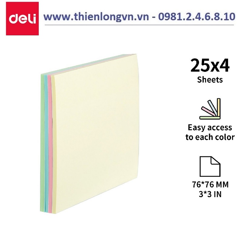 - Giấy nhắn 3x3 Deli A01802 có kích thước 76x76mm và có 4 màu/ tập
