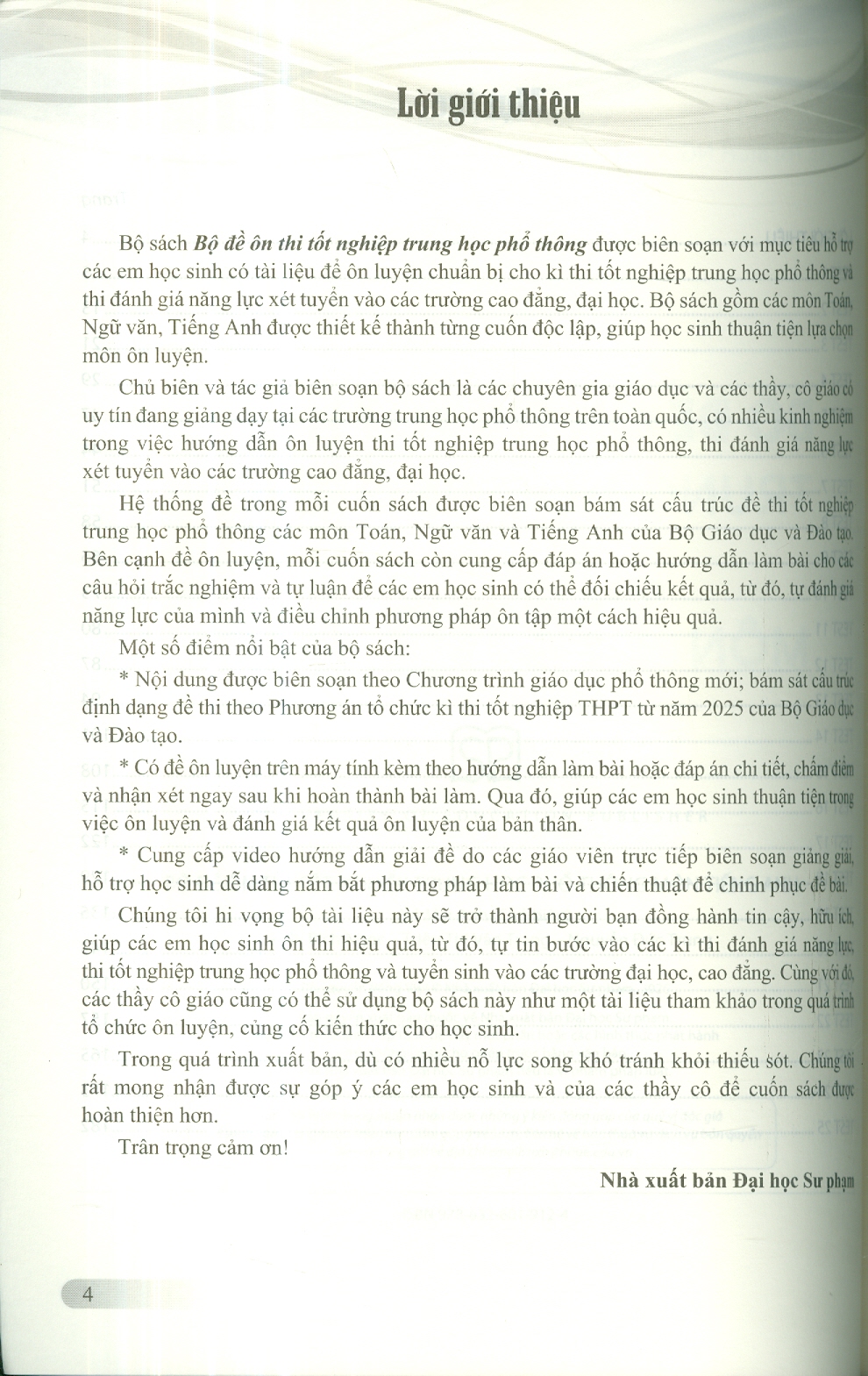 Bộ sách "Bộ đề ôn thi tốt nghiệp trung học phổ thông" (bao gồm các môn Toán, Ngữ văn, Tiếng Anh) là bộ tài liệu được biên soạn bởi đội ngũ chuyên gia và giáo viên uy tín, nhằm đáp ứng nhu cầu ôn luyện cấp thiết của học sinh theo Chương trình Giáo dục phổ thông 2018. Điểm khác biệt cốt lõi của bộ sách chính là sự bám sát tuyệt đối cấu trúc định dạng đề thi mới nhất của Bộ Giáo dục và Đào tạo, giúp học sinh làm quen với phương thức đánh giá năng lực hiện đại để xét tuyển vào các trường Đại học, Cao đẳng.