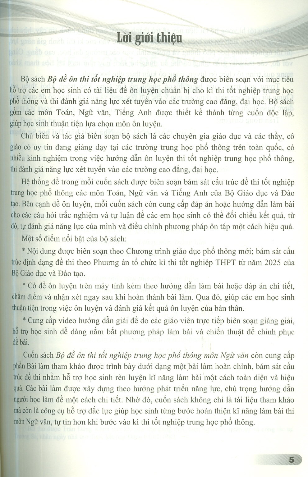 Bộ sách "Bộ đề ôn thi tốt nghiệp trung học phổ thông" (bao gồm các môn Toán, Ngữ văn, Tiếng Anh) là bộ tài liệu được biên soạn bởi đội ngũ chuyên gia và giáo viên uy tín, nhằm đáp ứng nhu cầu ôn luyện cấp thiết của học sinh theo Chương trình Giáo dục phổ thông 2018. Điểm khác biệt cốt lõi của bộ sách chính là sự bám sát tuyệt đối cấu trúc định dạng đề thi mới nhất của Bộ Giáo dục và Đào tạo, giúp học sinh làm quen với phương thức đánh giá năng lực hiện đại để xét tuyển vào các trường Đại học, Cao đẳng.