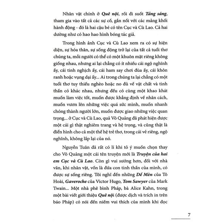 "Khi giới thiệu quyển truyện Quê Nội của Võ Quảng người ta bảo tôi: Đây là một loại Tôm Xây-dơ của Việt Nam. Đã từ lâu tôi rất thích tác phẩm Tôm Xây-dơ. Nhưng sau khi làm quen với tác phẩm của Võ Quảng tôi cảm thấy còn thích các nhân vật Cục và Cù Lao hơn.