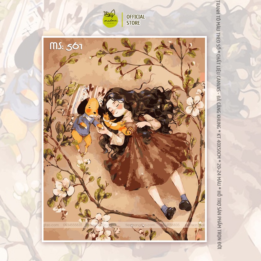 Giới thiệu Tranh tô màu 40x50cm có khung Cô Bé Tóc Rối Say Giấc dưới hoa T561